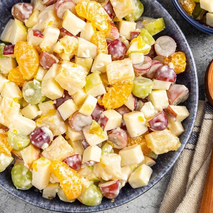 What sets this fruit salad apart is the tangy, creamy and slightly savory dressing. It’s made from a combination of cream cheese, sour cream, mayonnaise and sugar to blanket the fruit. The salad has hearty fruits that don’t leach out too much water, like apples and grapes, but if you want to add something more seasonal, choose fruits that will not make the dressing runny, like pitted cherries or cubed melon.