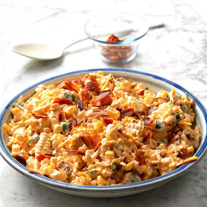 Jalapeno poppers are usually hot and gooey, so they aren’t the best make-ahead recipe for a potluck. This recipe takes all the flavors of those poppers and turns them into a cool and creamy corn salad with bits of bacon and plenty of cheese. The salad is a portable and crowd-pleasing barbecue side dish that tastes amazing at room temperature.