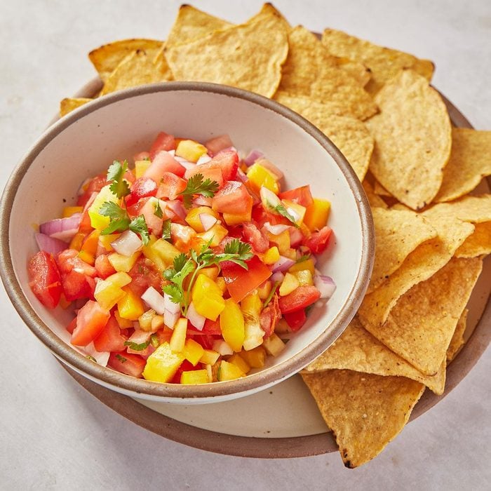 What makes this salsa different from a fruit salad comes down to the size of the chop. The finely chopped strawberry, orange and kiwi with crushed pineapple makes for an easy-to-scoop salsa. It’s served with homemade cinnamon-sugar tortilla chips. But you could skip those and use regular chips for a sweet-salty bite.
