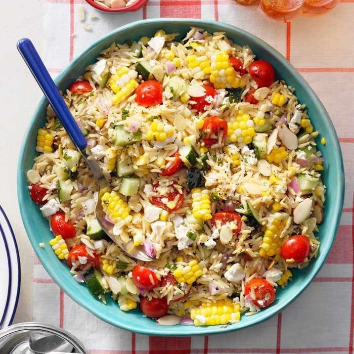 Orzo makes a delicious pasta salad because the small rice-shaped pieces quickly absorb the flavors of whatever it’s combined with. In this case, it’s a sharp vinaigrette and fresh vegetables. This recipe also has corn, tomatoes, cucumber, red onion and mint, but since produce is so abundant in the summer, you can easily add more vegetables. Or, play up the herbs and sprinkle in some basil, chives or parsley.