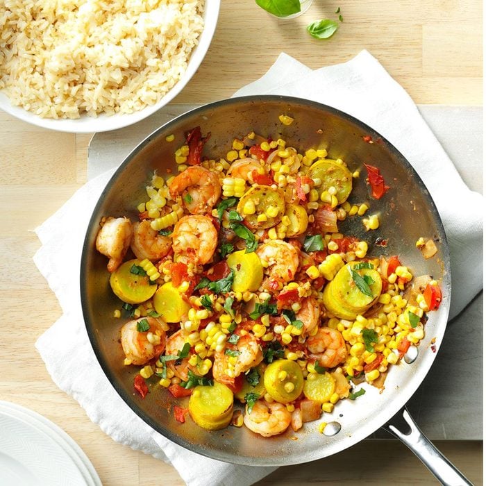 I make this seafood stir-fry at summer’s end when my garden is producing plenty of tomatoes, squash, garlic and corn. For a quick supper, we serve it over rice. —Lindsay Honn, Huntingdon, Pennsylvania